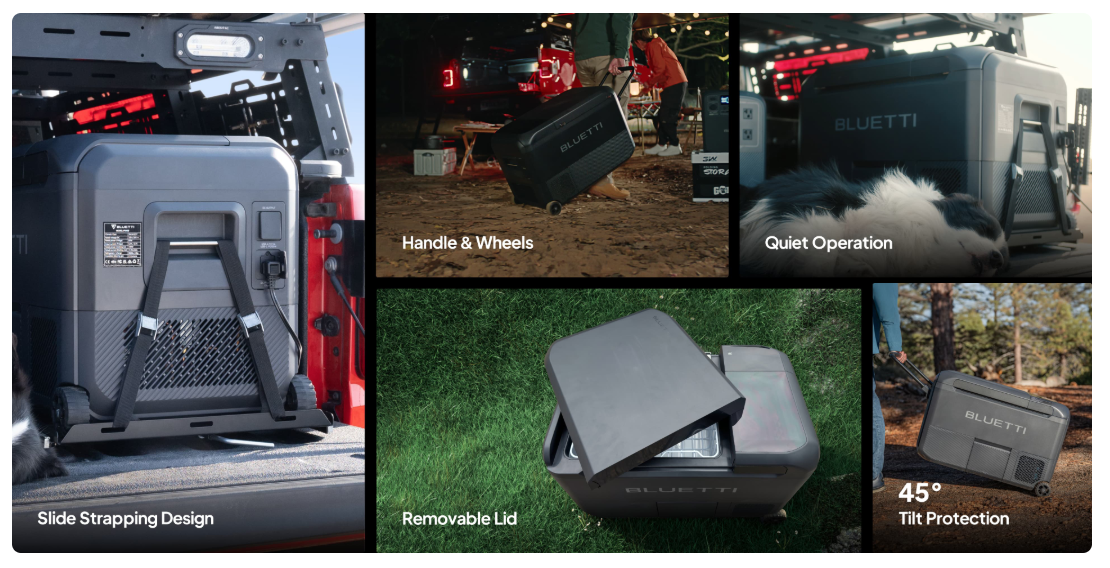 Fasten the fridge with your vehicle while driving, move it to your campsite with a sturdy handle and rolling wheels, and remove the lid for quick access your refreshments. With 45° tilt protection, you can rest assured that it remains stable on uneven ground. Plus, MultiCooler operates quietly, making it perfect for camping, picnics, or any outdoor gathering.
